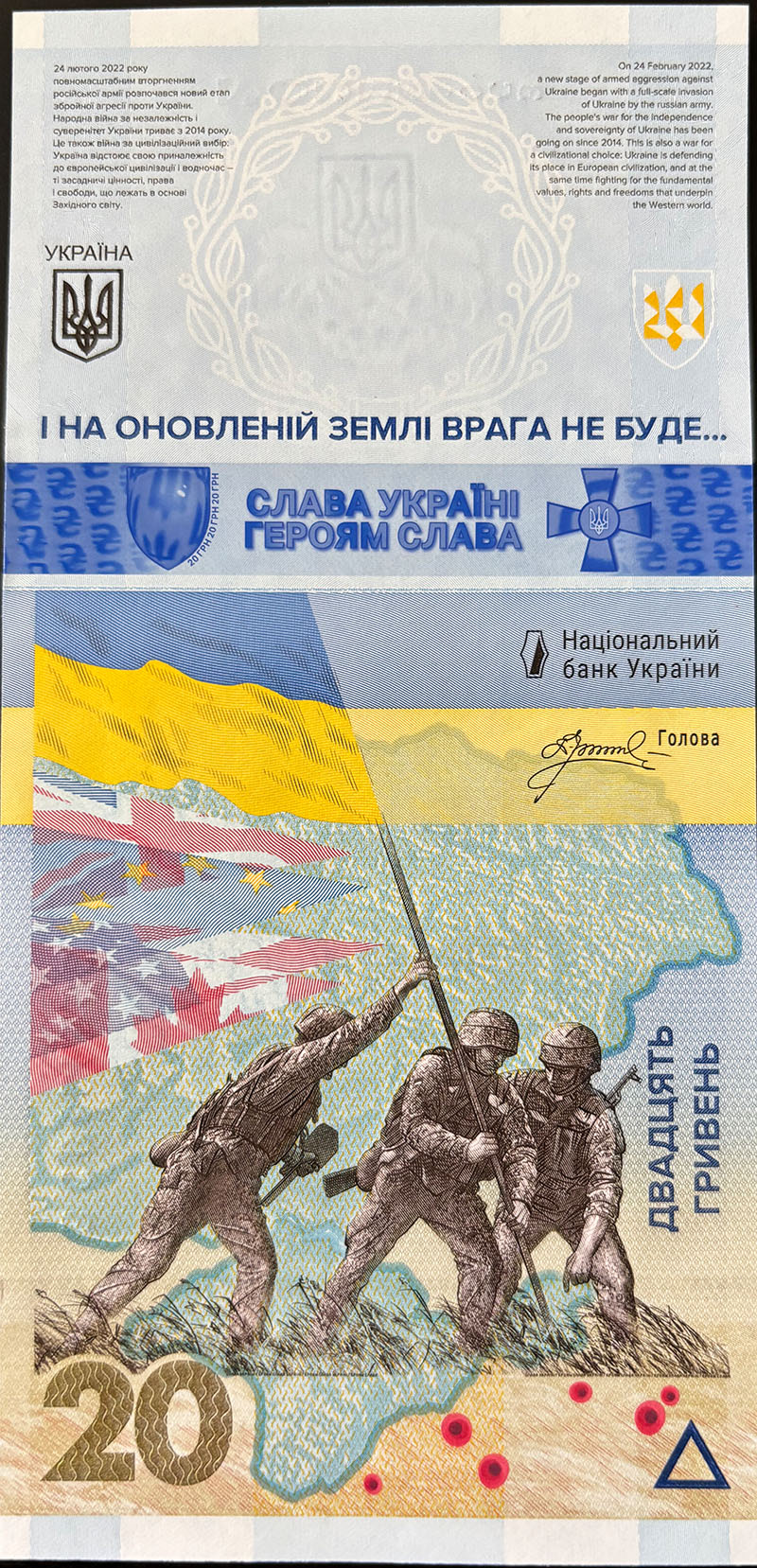 On February 24, 2023, to mark the first anniversary of the invasion, the National Bank of Ukraine issued a commemorative 20-hryvnia banknote titled REMEMBER! WE WILL NOT FORGIVE!