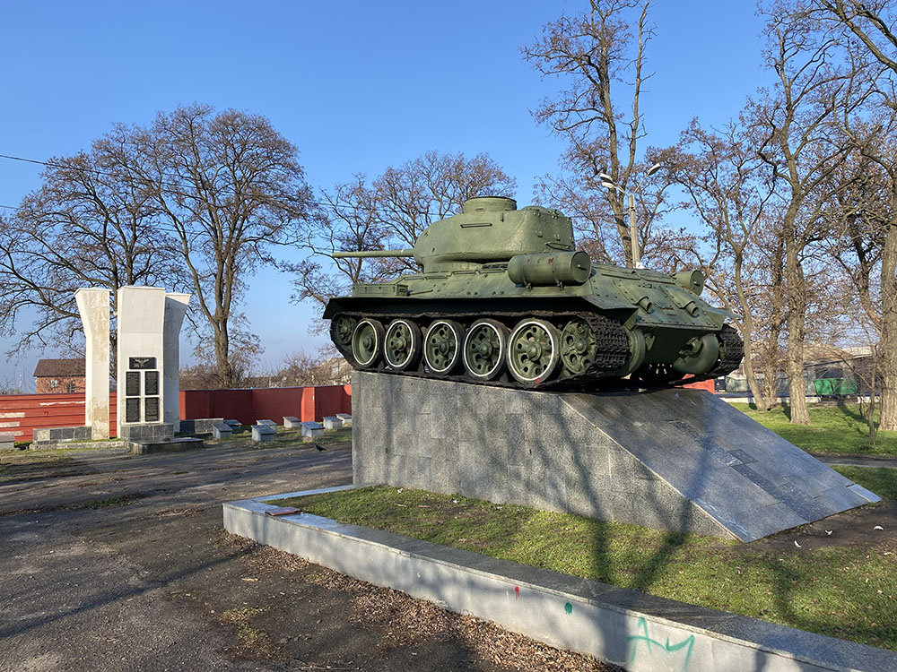 There are 27 mass graves and 3 individual graves next to the T-34 tank, and among the graves there is a remarkable grave of a young underground fighter – Alexander Miroshnichenko. The boy was behind the Germans to destroy communications, for which he was shot at age 13. Somewhere in the city there is his memorial plaque on one of the houses.