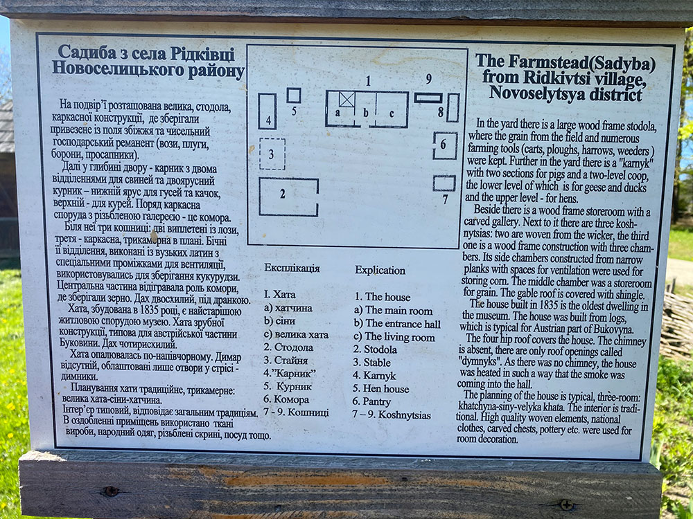 На території музею можна побачити стародавні млини та їхні внутрішні механізми, будинки, двори бідних і заможних жителів різних районів Буковини. Причому на подвір’ях все зроблено до найдрібніших деталей, навіть є грядки з овочами, на парканах стирчать горщики, а з дахів звисають качани кукурудзи – напевно так їхні мешканці сушили цю культуру.