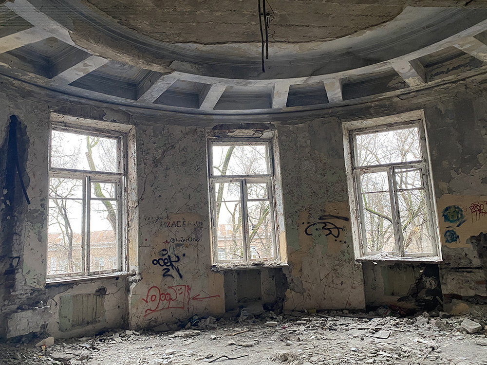 Можна увійти тільки з бічних корпусів і то, той із того, що стоїть ближче до Щербаня. Всередині повно сміття, зокрема медичного, серед будівельних руїн багато таврованої цегли. Відразу видно, що це дуже стара будова. І справді, у 2023 році буде рівно сто років як почалося будівництво Палацу Профілактики.