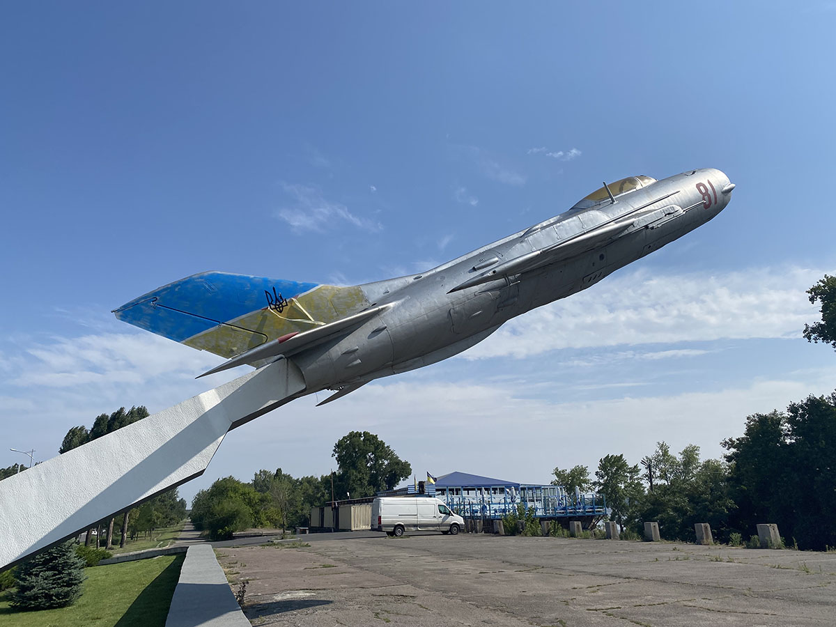 Самолет МИГ-19 установлен на набережной лицом к Днепру на бетонной стеле, которая как реактивная струя выходит из сопла двигателя самолета. Сейчас этот самолет без вооружения – просто стальная оболочка.
