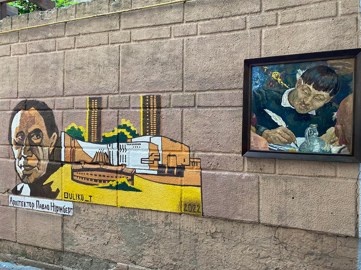 Это место расчистили, разрисовали муралами, сделали навес и повесили фонарики, превратив в креативное пространство для художников и прочих творческих людей. Неудивительно, что художественный переулок «Dnipro Art Street» расположился именно здесь – ведь рядом за стеной Музей Украинской Живописи и галерея-кафе Ван Гог.
